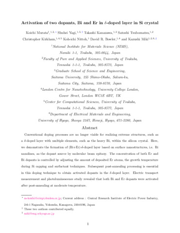 | Title: | Activation of two dopants, Bi and Er in delta-doped layer in Si crystal |