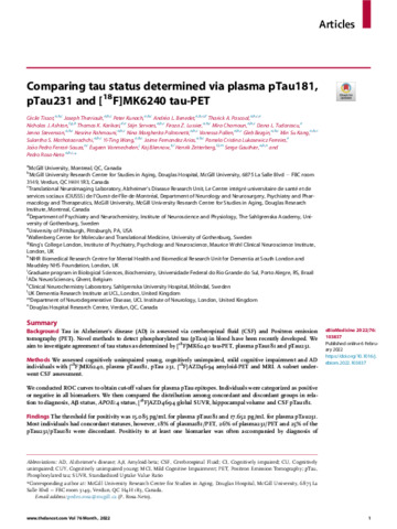 Background: Tau in Alzheimer's disease (AD) is assessed via cerebrospinal fluid (CSF) and Positron emission tomography (PET). Novel methods to detect phosphorylated tau (pTau) in blood have been recently developed. We aim to investigate agreement of tau status as determined by [18F]MK6240 tau-PET, plasma pTau181 and pTau231. / Methods: We assessed cognitively unimpaired young, cognitively unimpaired, mild cognitive impairment and AD individuals with [18F]MK6240, plasma pTau181, pTau 231, [18F]AZD4694 amyloid-PET and MRI. A subset underwent CSF assessment. We conducted ROC curves to obtain cut-off values for plasma pTau epitopes. Individuals were categorized as positive or negative in all biomarkers. We then compared the distribution among concordant and discordant groups in relation to diagnosis, Aβ status, APOEε4 status, [18F]AZD4694 global SUVR, hippocampal volume and CSF pTau181. / Findings: The threshold for positivity was 15.085 pg/mL for plasma pTau181 and 17.652 pg/mL for plasma pTau231. Most individuals had concordant statuses, however, 18% of plasma181/PET, 26% of plasma231/PET and 25% of the pTau231/pTau181 were discordant. Positivity to at least one biomarker was often accompanied by diagnosis of cognitive impairment, Aβ positivity, APOEε4 carriership, higher levels of [18F]AZD4694 global SUVR, hippocampal atrophy and CSF pTau181. / Interpretation: Plasma pTau181, pTau231 and [18F]MK6240 seem to reflect different stages of tau progression. Plasma biomarkers can be useful in the context of diagnostic information and clinical trials, to evaluate the disease stage. Moreover, they seem to confidently evaluate tau-PET positivity. / Funding: Moreover, this study was supported by Weston Brain Institute, Canadian Institute of Health Research and Fonds de Recherche du Québec.