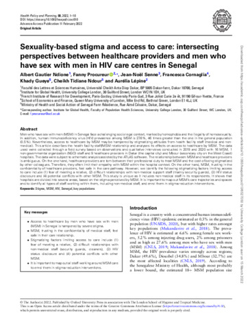 Title: | Sexuality-Based Stigma and Access to Care: Intersecting Perspectives Between Health Care Providers and Men Who Have Sex With Men in HIV Care Centres in Senegal |