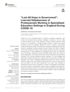 | Title: | “Lost All Hope in Government”: Learned Helplessness of Professionals Working in Specialised Education Settings in England During COVID-19 |