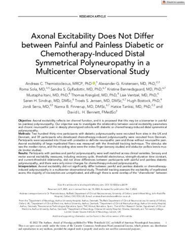 Title: | Axonal excitability does not differ between painful and painless diabetic or chemotherapy-induced distal symmetrical polyneuropathy in a multi-centre observational study |
