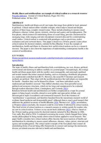 | Title: | Health, illness and neoliberalism: an example of critical realism as a research resource |