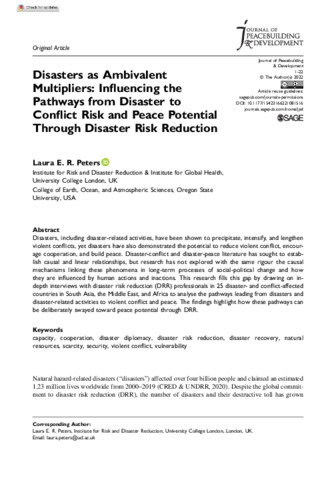 Disasters as Ambivalent Multipliers: Influencing the Pathways from Disaster to Conflict Risk and Peace Potential Through Disaster Risk Reduction.