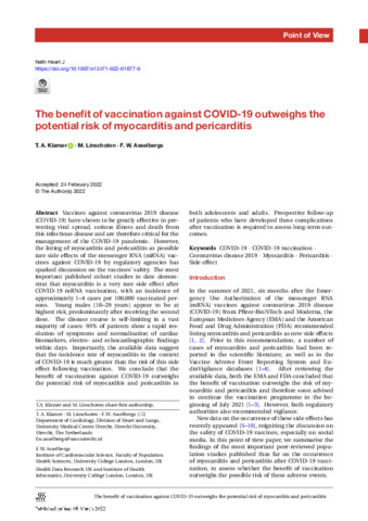 Title: | The benefit of vaccination against COVID-19 outweighs the potential risk of myocarditis and pericarditis |