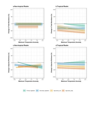 Several previous studies have investigated changes in insect biodiversity, with some highlighting declines and others showing turnover in species composition without net declines1,2,3,4,5. Although research has shown that biodiversity changes are driven primarily by land-use change and increasingly by climate change6,7, the potential for interaction between these drivers and insect biodiversity on the global scale remains unclear. Here we show that the interaction between indices of historical climate warming and intensive agricultural land use is associated with reductions of almost 50% in the abundance and 27% in the number of species within insect assemblages relative to those in less-disturbed habitats with lower rates of historical climate warming. These patterns are particularly evident in the tropical realm, whereas some positive responses of biodiversity to climate change occur in non-tropical regions in natural habitats. A high availability of nearby natural habitat often mitigates reductions in insect abundance and richness associated with agricultural land use and substantial climate warming but only in low-intensity agricultural systems. In such systems, in which high levels (75% cover) of natural habitat are available, abundance and richness were reduced by 7% and 5%, respectively, compared with reductions of 63% and 61% in places where less natural habitat is present (25% cover). Our results show that insect biodiversity will probably benefit from mitigating climate change, preserving natural habitat within landscapes and reducing the intensity of agriculture.