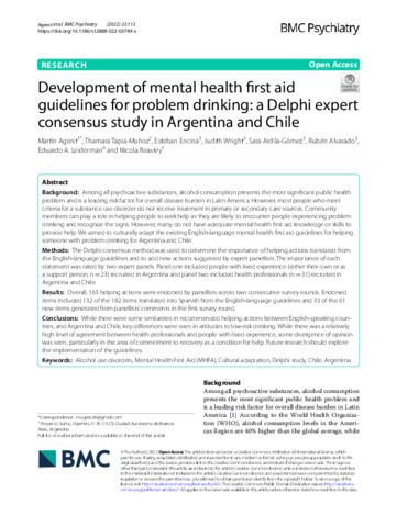 Title: | Development of mental health first aid guidelines for problem drinking: a Delphi expert consensus study in Argentina and Chile |