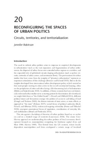 In the wake of both post-colonial critiques of urban studies and the emerging realities of “planetary urbanization,” there is a need to revisit theories of urban politics. As urban forms across the globe are becoming fragmented and often extend across vast areas, earlier theoretical analyses of urban politics that focused closely on the municipal institutions and configurations of actors in a North American idiom have become increasingly redundant. Rapid urban growth and extending urban forms give rise to new territories of urban politics, including city-regions, operational landscapes, and large-scale developments. In reconfiguring the spaces of urban politics, attention needs to be directed to the wide range of transnational actors and practices, circulating policies as well as material and financial flows, which are key drivers of urban development and compose the field of urban politics. This chapter reviews accounts of the spatialities of urban politics. It then draws on empirical research on city strategies and on large-scale urban developments to propose ways in which the circuits, territories, and territorializations of the politics of urban development might be conceptualized. At the same time, emergent territories of urban politics provide the justification and grounds for wider comparative analyses and theory-building across diverse, specific urban contexts.