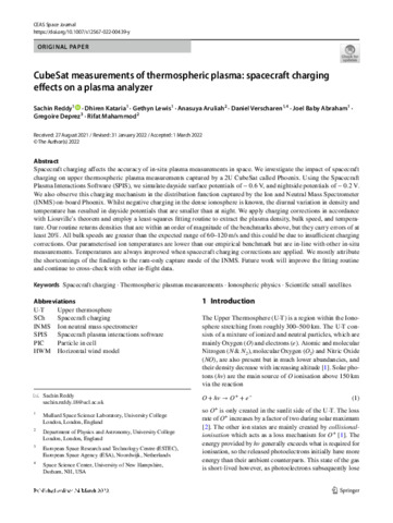 Title: | CubeSat measurements of thermospheric plasma: spacecraft charging effects on a plasma analyzer |