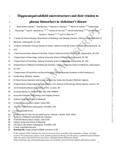 Hippocampal-subfield microstructures and their relation to plasma biomarkers in Alzheimer's disease.