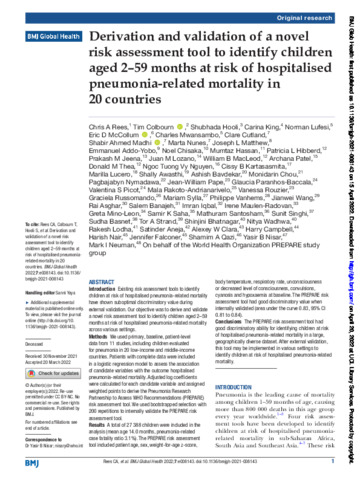 Title: | Derivation and validation of a novel risk assessment tool to identify children aged 2-59 months at risk of hospitalised pneumonia-related mortality in 20 countries |
