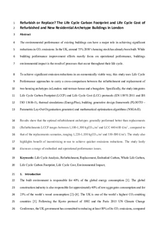 | Title: | Refurbish or replace? The Life Cycle Carbon Footprint and Life Cycle Cost of Refurbished and New Residential Archetype Buildings in London |