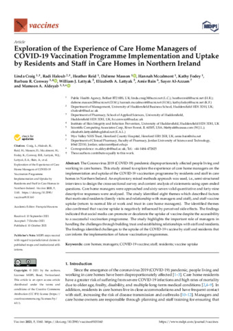 Title: | Exploration of the Experience of Care Home Managers of COVID-19 Vaccination Programme Implementation and Uptake by Residents and Staff in Care Homes in Northern Ireland |