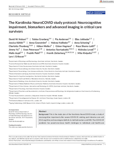 Title: | The Karolinska NeuroCOVID study protocol: Neurocognitive impairment, biomarkers and advanced imaging in critical care survivors |