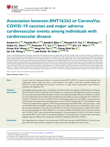 | Title: | Association between BNT162b2 or CoronaVac COVID-19 vaccines and major adverse cardiovascular events among individuals with cardiovascular disease |