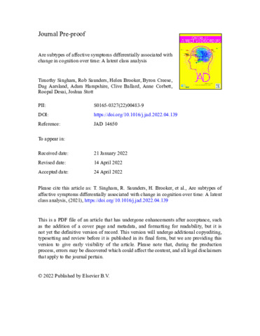 | Title: | Are subtypes of affective symptoms differentially associated with change in cognition over time: A latent class analysis |
