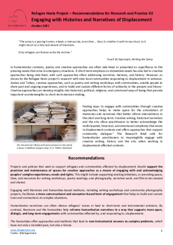 In humanitarian contexts, poetry and creative approaches are often side-lined or presented as superfluous to the pressing needs that arise in emergency situations. A short-term emphasis on immediate needs has also led to creative approaches being side-lined, with such approaches often addressing narrative, memory, and history. However, as shown by the Refugee Hosts project’s research with nine local communities responding to displacement in Lebanon, Jordan and Turkey, creative approaches, such as poetry and writing workshops with communities, enable people to share past and ongoing experiences, and to build and sustain different forms of solidarity in the present and future. Creative approaches can develop insights into historical, political, religious, and communal ways of being that provide important counterweights to short-term decision making. Finding ways to engage with communities through creative approaches helps to make space for the articulation of memories and narratives that better inform interventions in the short and long-term. Creative writing, historical narratives and the arts allow practitioners to better acknowledge the multi-layered, historical, and emotional complexity that exists in displacement contexts and offers approaches that support community dialogue. This Research Brief calls for humanitarian practitioners to meaningfully engage with creative writing, history and the arts when working in displacement-affected contexts.