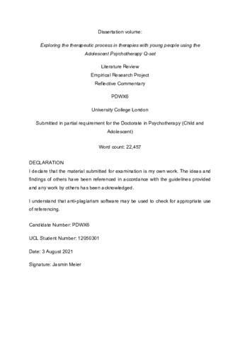 Background: The Adolescent Psychotherapy Q-set (APQ) is a pan-theoretical empirically validated process measure with potential for statistical analysis describing the unique characteristics of therapy sessions conducted with adolescents. Aims: This literature review aims to examine the development of the APQ and its applications in research and practice to guide future applications. Methods: A literature search on the PsycInfo and UCL Explore search engines and subsequent scanning of search results yielded nine published studies using the APQ. One unpublished study was made available to the author by the measure developer. Process: Studies were critically reviewed one by one paying attention to their research methodology, innovative use of the APQ, and their contributions to the field of adolescent psychotherapy process research. The APQ’s applications in this small body of literature was then evaluated. A review of relevant applications of the APQ’s child and adult equivalents highlighted directions for the APQ’s future potential. Results: Following its empirical validation, the APQ has been applied theoretically, in research of clinical practice, and in supervision. The APQ’s application to create therapy prototypes of therapy modalities has shown its good discriminatory quality and suitability to study treatment adherence. Using the APQ across therapies has shown it can detect important trends in therapy processes across large data sets. The APQ’s applications in single-case studies has shown the measures’ suitability to this research methodology, having already produced important insights in adolescent therapy process research. The review found the APQ to be sensitive to subtle differences in therapeutic techniques and interactions whilst possibly missing non-verbal factors and within-session variability. The APQ’s use of direct observation in real-life clinical settings, suitability for various statistical analyses and triangulation as well as its potential to find process-outcome links in adolescent therapy are clear advantages. Conclusions: Although empirical research conducted with the APQ is in its infancy, its applications so far have shown the versatility of this measure and its potential to add knowledge to the field of adolescent psychotherapy process research. The review highlights important methodological directions for future research, including a move beyond research based on modality prototypes. Part 2: Empirical Research Project What therapy processes precede dissatisfied dropout in STPP for adolescent depression: a single-case qualitative exploration guided by the Adolescent Psychotherapy Q-set Abstract Background: A significant percentage of young people in treatment for depression drop out of psychotherapy, some due to dissatisfaction with the therapy offered. The therapeutic processes preceding dissatisfied dropouts in the adolescent population are insufficiently understood. Aims: The current single-case study aimed to explore the therapeutic process of a 12-session, prematurely-ended therapy with a young person dissatisfied with short-term psychoanalytic psychotherapy (STPP) received for depression. Methods: The Adolescent Psychotherapy Q-set (APQ), an empirically validated process measure, was used in tandem with clinical case analysis to explore the therapy process over time. Results: The analysis of twelve APQ ratings found a productive patient-therapy couple working collaboratively to understand the young person’s experiences and emotions. Following an initial phase of the young person presenting as emotional and vulnerable, she became increasingly ambivalent about partaking in psychotherapy. A lively and argumentative period exploring the young person’s ambivalence and increased sense of well-being culminated in eventual dropout. Conclusion: Even in a strong, collaborative working relationship with an engaged young person, ambivalence around dependency and vulnerability can threaten treatment completion. The APQ is a suitable measure to explore general treatment processes preceding dropout, but its usefulness could be enhanced through systematic methodological pluralism.