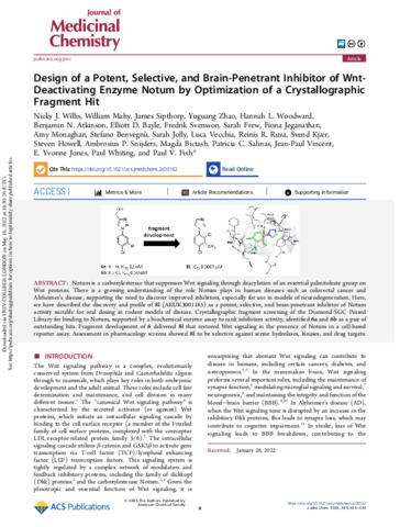 Title: | Design of a Potent, Selective, and Brain-Penetrant Inhibitor of Wnt-Deactivating Enzyme Notum by Optimization of a Crystallographic Fragment Hit |