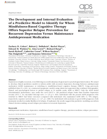 Title: | The Development and Internal Evaluation of a Predictive Model to Identify for Whom Mindfulness-Based Cognitive Therapy Offers Superior Relapse Prevention for Recurrent Depression Versus Maintenance Antidepressant Medication |