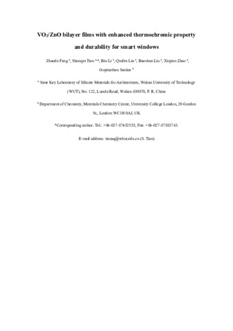 VO₂/ZnO bilayer films with enhanced thermochromic property and durability for smart windows.