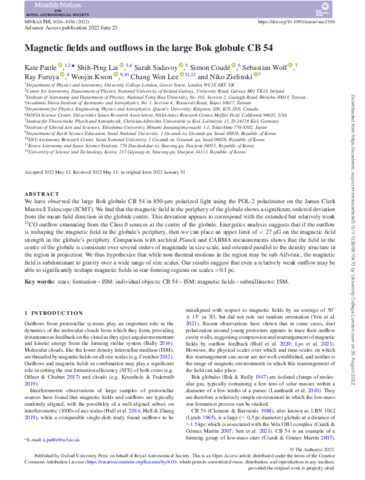 Title: | Magnetic fields and outflows in the large Bok globule CB 54 |