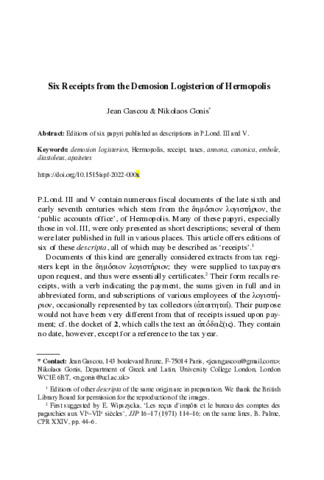 Keywords: | demosion logisterion, Hermopolis, receipt, taxes, annona, canonica, embole, diastoleus, apaitetes |