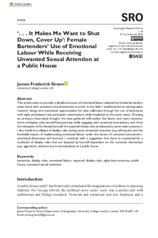 Title: | ‘. . . It Makes Me Want to Shut Down, Cover Up’: Female Bartenders’ Use of Emotional Labour While Receiving Unwanted Sexual Attention at a Public House |