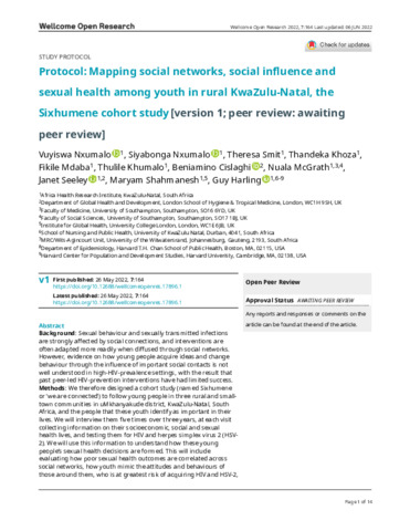 | Title: | Protocol: Mapping social networks, social influence and sexual health among youth in rural KwaZulu-Natal, the Sixhumene cohort study [version 1; peer review: awaiting peer review] |