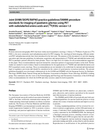 | Title: | Joint EANM/SIOPE/RAPNO practice guidelines/SNMMI procedure standards for imaging of paediatric gliomas using PET with radiolabelled amino acids and [¹⁸F]FDG: version 1.0 |