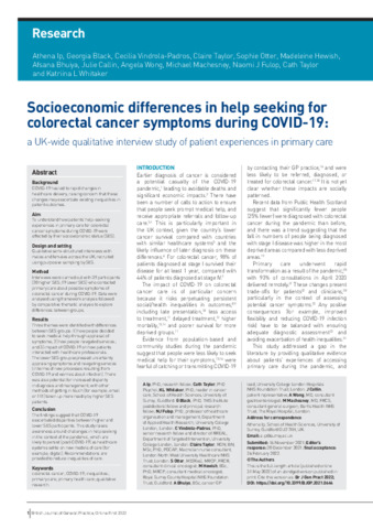 Socioeconomic differences in help seeking for colorectal cancer symptoms during COVID-19: a UK-wide qualitative interview study of patient experiences in primary care.