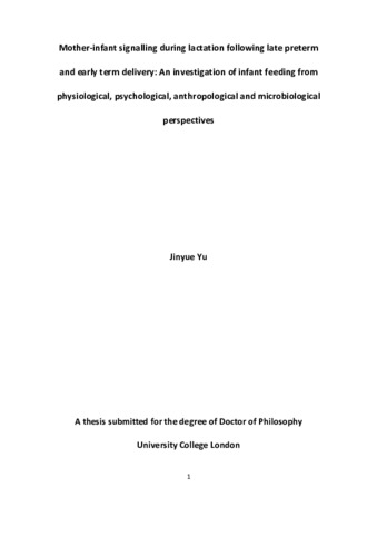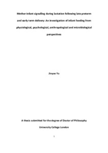 Title: | Mother-infant signalling during lactation following late preterm and early term delivery: An investigation of infant feeding from physiological, psychological, anthropological and microbiological perspectives |