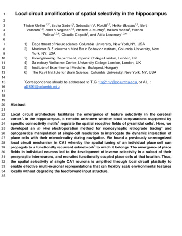 Title: | Local circuit amplification of spatial selectivity in the hippocampus |