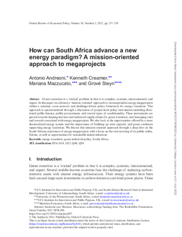 | Title: | How can South Africa advance a new energy paradigm? A mission-oriented approach to megaprojects |