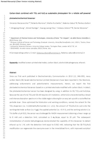Title: | Carbon-black combined with TiO2 and KuQ as sustainable photosystem for a reliable self-powered photoelectrochemical biosensor |