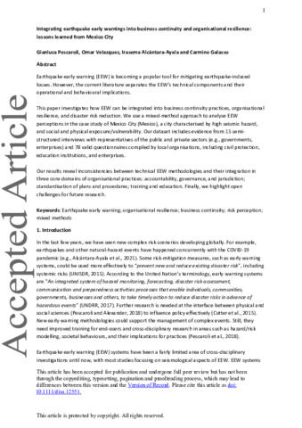 Disasters - 2022 - Pescaroli - Integrating earthquake early warnings into business continuity and organisational resilience.pdf - Accepted Version Download (741kB) | Preview |