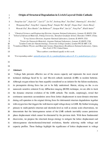 Title: | Origin of structural degradation in Li-rich layered oxide cathode |