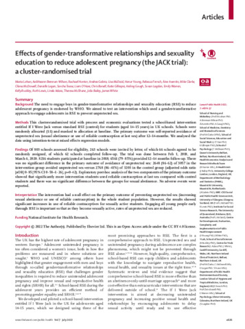| Title: | Effects of gender-transformative relationships and sexuality education to reduce adolescent pregnancy (the JACK trial): a cluster-randomised trial |