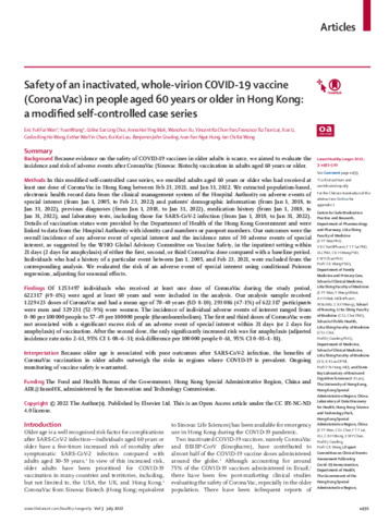 Safety of an inactivated, whole-virion COVID-19 vaccine (CoronaVac) in people aged 60 years or older in Hong Kong: a modified self-controlled case series.