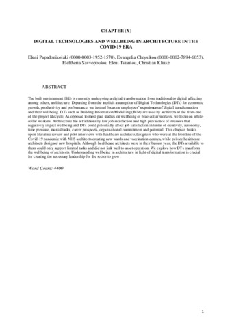 The built environment (BE) is currently undergoing a digital transformation from traditional to digital, affecting among others, architecture. Departing from the implicit assumption of digital technologies (DTs) for economic growth, productivity and performance, we instead focus on employees’ experiences of digital transformation and their well-being. DTs such as building information modelling (BIM) are used by architects at the front end of the project life cycle. As opposed to most past studies on well-being of blue-collar workers, we focus on white-collar workers. Architecture has a traditionally low job satisfaction and high prevalence of stressors that negatively impact well-being, and DTs could potentially affect job satisfaction in terms of creativity, autonomy, time pressure, menial tasks, career prospects, organisational commitment and potential. This chapter builds upon literature review and pilot interviews with healthcare architects/designers who were at the front line of the COVID-19 pandemic with NHS architects, creating new wards and vaccination centres, while private healthcare architects designed new hospitals. Although healthcare architects were in their busiest year, the DTs available to them could only support limited tasks and did not link well to asset operation. We explore how DTs transform the well-being of architects. Understanding well-being in architecture in light of digital transformation is crucial for creating the necessary leadership for the sector to grow.