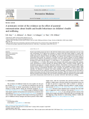 Title: | A systematic review of the evidence on the effect of parental communication about health and health behaviours on children's health and wellbeing |