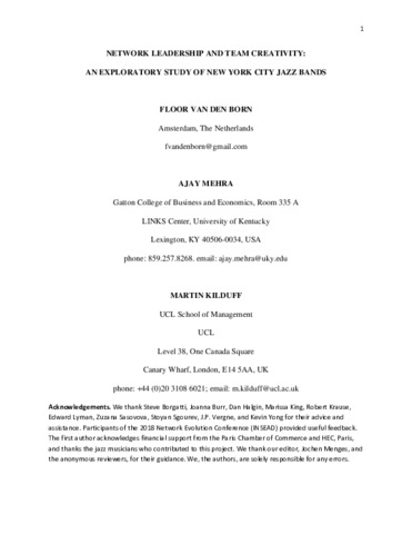 Title: | Network Leadership and Team Creativity: An Exploratory Study of New York City Jazz Bands |