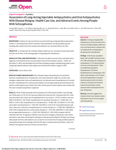 IMPORTANCE: Evidence for improved clinical outcomes with long-acting injectable antipsychotics (LAIAs) vs oral antipsychotics (OAs) is limited in Asian populations and special patient groups, including older people (>65 years), people with substance use, and early initiators of LAIAs. OBJECTIVE: To compare the risk of disease relapse, health care use, and adverse events associated with the use of LAIAs vs OAs among people in Hong Kong with schizophrenia. DESIGN, SETTINGS, AND PARTICIPANTS: In this self-controlled case series study, individuals with a diagnosis of schizophrenia who were prescribed LAIAs and OAs between January 1, 2004, and December 31, 2019, were identified from the Clinical Database Analysis and Reporting System of the Hong Kong Hospital Authority. Data analysis was conducted from May to August in 2021. EXPOSURES: Use of LAIAs vs OAs. MAIN OUTCOMES AND MEASURES: Risk of disease relapse (hospitalizations for psychiatric disorders, hospitalizations for schizophrenia, and suicide attempts), health care use (all-cause emergency department visits and hospitalizations), and adverse events (hospitalizations for somatic disorders, hospitalizations for cardiovascular diseases, and extrapyramidal symptoms) between the period in which patients were treated with LAIAs and the period in which patients were treated with OAs were compared using Poisson regression. RESULTS: Of the 70 396 individuals with schizophrenia (37 200 women [52.8%]; mean [SD] age, 44.2 [15.8] years), 23 719 (33.7%) were prescribed both LAIAs and OAs. Compared with OAs, LAIAs were associated with a lower risk of hospitalizations for any cause (n = 20 973; incidence rate ratio [IRR], 0.63 [95% CI, 0.61-0.65]), hospitalizations for psychiatric disorders (n = 19 283; IRR, 0.52 [95% CI, 0.50-0.53]), hospitalizations for schizophrenia (n = 18 385; IRR, 0.53 [95% CI, 0.51-0.55]), and incident suicide attempts (n = 1453; IRR, 0.56 [95% CI, 0.44-0.71]). During full treatment with LAIAs, there was a reduction in hospitalizations for somatic disorders (n = 15 396; IRR, 0.88 [95% CI, 0.85-0.91]), hospitalizations for cardiovascular diseases (n = 3710; IRR, 0.88 [95% CI, 0.81-0.96]), and extrapyramidal symptoms (n = 22 182; IRR, 0.86 [95% CI, 0.82-0.91]) compared with full treatment with OAs. No significant difference was found for emergency department visits. Similar associations were observed during the subsequent treatment periods (beyond 90 days) and among older people and those with substance use, except for an increased risk of extrapyramidal symptoms among older people when initiating LAIAs (first 90 days). Compared with late initiators, early LAIA initiators had a greater reduction in these outcome events. CONCLUSIONS AND RELEVANCE: This self-controlled case series study of people in Hong Kong with schizophrenia suggests that LAIAs were associated with a lower risk of disease relapse and hospitalization than OAs, without an increased risk of adverse events. Clinicians should more broadly consider the long-term use of LAIAs for Chinese people with schizophrenia, especially early in the course of illness.
