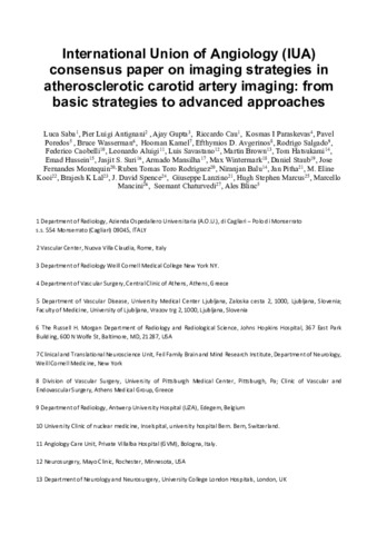 Title: | International Union of Angiology (IUA) consensus paper on imaging strategies in atherosclerotic carotid artery imaging: From basic strategies to advanced approaches |