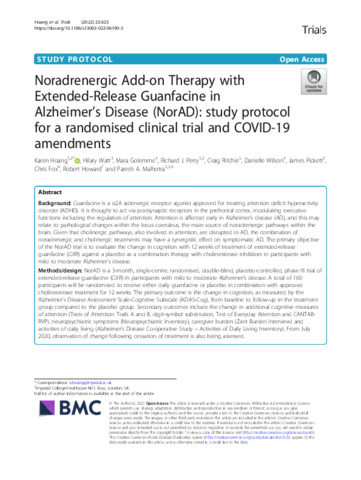 Title: | Noradrenergic Add-on Therapy with Extended-Release Guanfacine in Alzheimer's Disease (NorAD): study protocol for a randomised clinical trial and COVID-19 amendments |