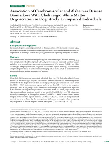 | Title: | Association of Cerebrovascular and Alzheimer Disease Biomarkers With Cholinergic White Matter Degeneration in Cognitively Unimpaired Individuals |