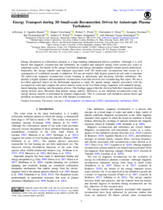 Title: | Energy transport during 3D small-scale reconnection driven by anisotropic plasma turbulence |