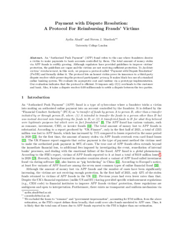 Title: | Payment with Dispute Resolution: A Protocol For Reimbursing Frauds' Victims |