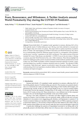 | Keywords: | Environmental & Occupational Health, Environmental Sciences & Ecology, premature birth, preterm birth, NICU, maternal mental health, paternal mental health, child development, COVID-19, Twitter, POSTPARTUM DEPRESSION, POSTTRAUMATIC-STRESS, RISK-FACTORS, CARE, PRETERM, INFANTS, BIRTH, EXPERIENCES, PREVALENCE, KANGAROO |