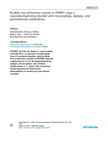 Title: | Bi-allelic loss-of-function variants in PPFIBP1 cause a neurodevelopmental disorder with microcephaly, epilepsy, and periventricular calcifications |