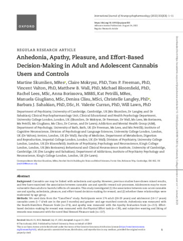 Title: | Anhedonia, apathy, pleasure, and effort-based decision-making in adult and adolescent cannabis users and controls |